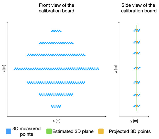 Acquired 3D points belonging to the calibration board and their projection on an estimated plane P.