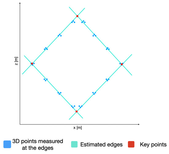 With the plane P and using only the coordinates of the 3D points, we can now detect the edges of the calibration board and, hence, the lines describing these edges. In order to do so, the RANSAC algorithm is used again to estimate the lines describing the edges. By equating these lines, the coordinates of the key points of the calibration board are estimated, as presented in Figure 10. By utilizing the plane P, we can obtain the 3D coordinate of the detected key points.