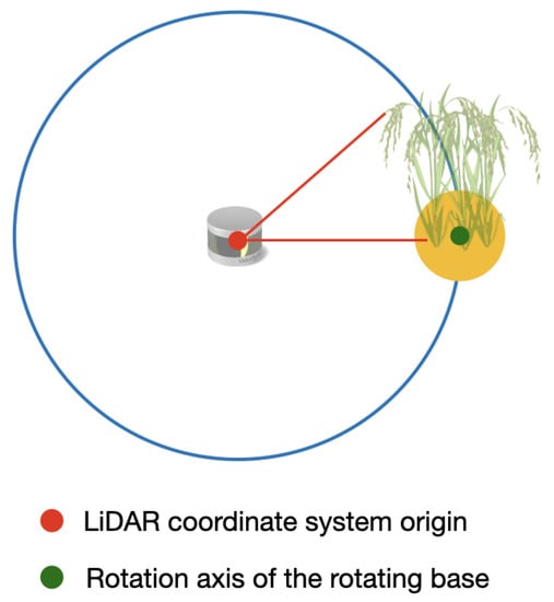 The LiDAR delivers the distance information of a point in the axes regarding to its own center, as it can be seen in Figure 11. Hence, in order to rotate the point clouds relative to the angle of the rotating base, it is necessary to find the coordinates of the center of the rotating base.