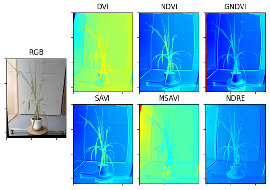 Vegetation indices are widely used to quantify plant variables by associating certain spectral reflectances that are highly related to variations in leaf chemical components such as nitrogen, chlorophyll, and other nutrients. In this regard, vegetation indices are key features to characterize the health status of a plant. From the extensive list of vegetation indices available in the specialized literature [29,30,31], we selected 6 vegetation indices with sufficient experimental evidence and quantitative trait loci (QTL)-based characterization regarding their high correlation with plant health, specifically, the photosynthetic activity associated with certain spectral reflectances: green and near-infrared bands.