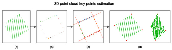 Key points estimation in a 3D point cloud. (a) Point cloud of the calibration board. (b) Extraction of points belonging to the edges of the calibration board. (c) Edge lines intersection and estimated key points. (d) Projection of the key points into the 3D space.