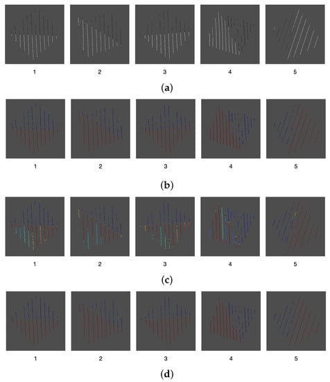 With these five complete samples (point clouds and 2D images), Algorithm 4 was applied in order to assign the corresponding color information to each point in the cloud, as shown in Figure 17a. Subsequently, using color segmentation, a thresholding stage was applied to the point clouds: points close to a black color took the value of , those close to a white color took the value of and the remaining points took the value of . Figure 17b shows the point clouds after this color thresholding stage.