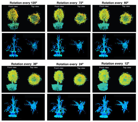 Since the main goal of this research project is the generation of complete 4D phenotyping models, an experiment was performed first to verify how the morphological and biological parameters extracted from the plant were affected by using different rotation angles at the time of sensing. For this purpose, the Limonaria and Guaiacum plants were scanned with steps of , , , , , and , simultaneously using the LiDAR and the multispectral camera. Subsequently, Algorithm 4 was executed to obtain the sensory fusion between each 3D point cloud and each multispectral camera image. By using Algorithm 7, the registration of the point clouds with color information was done, obtaining the 4D phenotyping models. The 4D phenotyping models of both Guaiacum and Limonaria plants are shown in Figure 18.