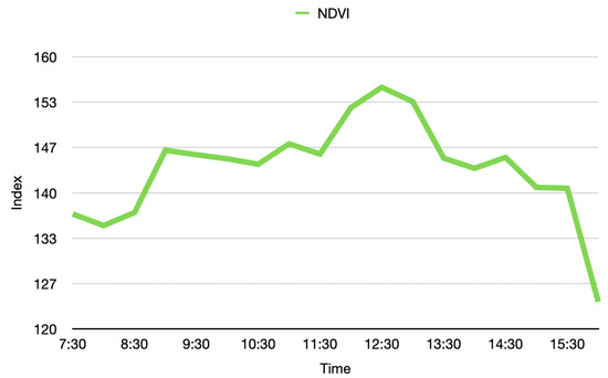 Figure 19 and Figure 20 present a very interesting behavior that would not be easy to predict or validate. Although NDVI is useful for vegetation monitoring, specially because it should compensate for varying illumination conditions. Moreover, the NDVI has the advantage of weighting more the light reflectances in both NIR and green compared to other wavelengths, which enables to characterize the plant health status. Our results show that a variation of this metric indeed occurs at different hours of the day. With that limitation, the analysis process that utilizes the NDVI index would require an adjustment in order to consider this natural behavior, as presented next in the discussion section.