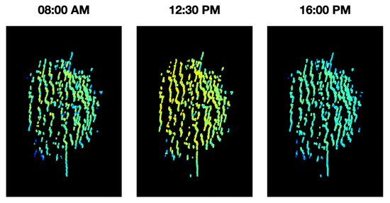 Thus, as shown in Figure 19 and Figure 20, the temporal distribution of the biochemical parameters of the plant can be studied with the 4D models that are generated by the implemented platform. In this case, the results obtained show how the levels of the NDVI index of the plant have maximum at noon, when the sun rays’ intensity is also at its maximum levels. These results evince a relationship between the amount of sunlight that the plant can absorb during day hours and its vegetative indices. Furthermore, plant-health status is usually characterized throughout the entire phenological state of the crop, however, in Figure 19, we note that the NDVI index shows significant fluctuations during the day, allowing an analysis with a higher and more precise temporal resolution.