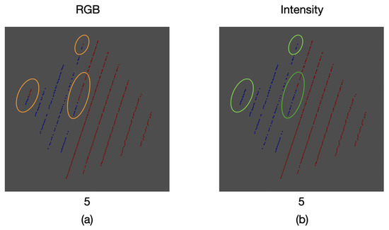Comparison between thresholding stages: (a) RGB color information, (b) intensity information. Some areas with wrongly mapped points are highlighted.