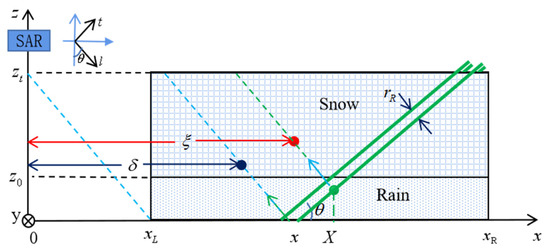 For the surface backscattering echoes caused by the ground are still unattenuated, there are snowfall backscattering echoes, and the rainfall backscattering echoes start to occur. The Equations (A8)–(A11) still hold, but the extinction coefficient and the radar reflectivity differ: