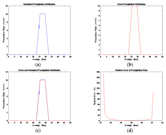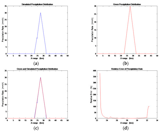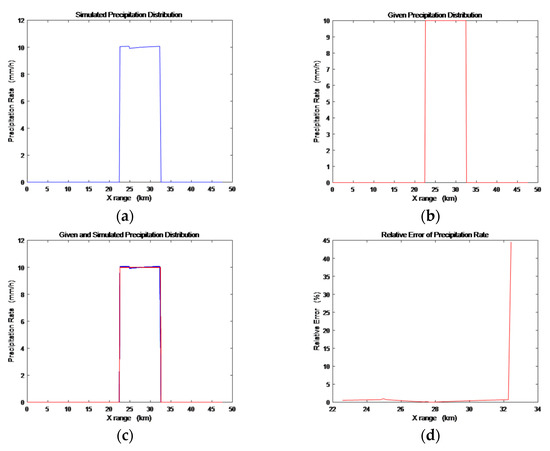 For X-band SAR working at the oblique angle of 30°, is approximately −7 dB [29]. Set and . From Equations (12), (16) and (18), we can first obtain the normalized radar cross section (NRCS) of the double-layer precipitation model. With Formulas (6) or (7), we can obtain the horizontal precipitation variation of the model. Taking a rectangular rain-cloud cell, a trapezoidal rain-cloud cell, a triangular rain-cloud cell and two separate rectangular rain-cloud cells under the rain rate of 10 as Examples 1–4, the precipitation variation simulation result diagrams, given precipitation variation diagrams, comparison diagrams and absolute error diagrams are shown in Figure 2, Figure 3, Figure 4 and Figure 5. Taking a triangular rain-cloud cell under the rain rate of 30 and 50 as Examples 5–6, the precipitation variation simulation result diagrams, given precipitation variation diagrams, comparison diagrams and relative error diagrams are shown in Figure 6 and Figure 7. The attributes of the six examples, including the maximum rain rate (), the width of the rain-cloud cells , the shape parameters and the shapes of rain-clouds are listed in Table 2. The simulation results of the attributes are listed in Table 3, where () is the simulated result of the maximum rain rate, () is the relative error of the maximum rain rate, is the simulated result of the width of the rain cloud and is the relative error of the width of the rain cloud.