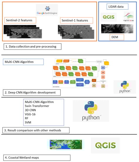 Figure 1 presents the flowchart of the proposed method. As seen, Sentinel-1 and Sentinel-2 features were collected from the Google Earth Engine (GEE) platform, while DEM was generated from LiDAR data with the use of QGIS software and the LAS tool. Then, the Python programming language was employed to develop the proposed multi-model DCNN classifier. Results of the proposed classifier were then compared with Swin transformer, 3D CNN, VGG-16, RF, and SVM classifiers. Finally, coastal wetland classified maps were produced in QGIS software.