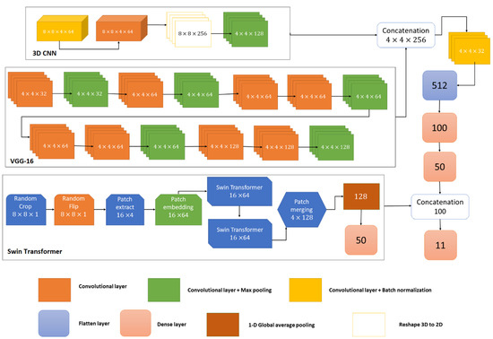 In this study, we used the Adam optimizer to train our proposed multi-model deep learning network as well as the other deep learning models, including the modified version of the VGG-16 network, 3D CNN, and Swin transformer with a learning rate of 0.0002. We set the maximum training iteration to 100 epochs with a batch size of 32. In the Swin transformer, we used patch size, dropout rate, number of attention heads, embedding dimension, number of multi-layer perceptron, and shift size of , 0.03, 8, 64, 256, and 1, respectively. It is worth highlighting that for the implementation of classifiers, we used a graphical processing unit (GPU) of NVIDIA GeForce RTX 2070, an Intel processor (i.e., i7-10750H central processing unit (CPU) of 2.60 GHz), and a 16 GB random access memory (RAM) operating on 64-bit Windows 11 in our experiments. All deep learning algorithms were developed in the Python TensorFlow library, while the RF and SVM classifiers were implemented using sklearn Python library.