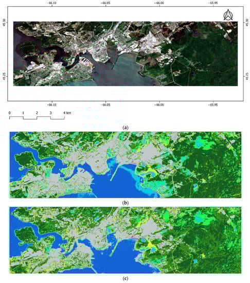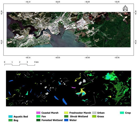 Wetlands are basically regions flooded or saturated by water for at least a portion of the year, though this definition differs widely depending on the field of interest [1,2,3]. Wetlands are vital for biodiversity, ecological security, and humans as they perform a variety of functions and provide various ecosystem services [4,5,6]. Wetland services include climate regulation, water filtration, flood and drought mitigation, shoreline erosion preservation, soil protection, and wildlife habitat, among others [7,8,9,10]. Wetlands have deteriorated and degraded considerably around the world in recent decades as a result of increased human activity and climatic changes [11,12,13]. Wetland degradation has resulted in significant ecological repercussions such as biodiversity loss, habitat fragmentation, floods, and droughts [14,15,16]. Around two-thirds of the world’s wetlands have been lost or drastically altered since the turn of the last century [17,18]. Land-use change due to the settlement of Europeans, development, agriculture, and associated bi-products such as re-direction of run-off and pollution were all historical drivers of wetland loss in Canada [19]. On the other hand, climate change has recently emerged as a serious environmental challenge that has the potential to aggravate ongoing wetland loss and change [20,21]. Studies show how climate change has the potential to increase the number of fires and affect the ability of wetlands and neighboring habitats to recover from natural disasters [22,23]. On the other hand, even though wetlands make up only 6% of worldwide land cover, wetland species account for 24% of the world’s invasive plants [24]. Invasive species pose a severe threat to coastal wetlands because they can develop in dense, monolithic stands, out-competing native species and affecting the structure of wetlands [24]. A coastal wetland is an environment with a depth range between the lower subtidal zone, where sunlight can penetrate and sustain photosynthesis by benthic plant communities, and the landward border, where the sea’s hydrologic influence is ceded to groundwater and atmospheric processes [25,26]. These wetlands, which connect land and sea, are characterized by complicated hydrological processes that are susceptible to degradation [27,28,29]. For enhancing our understanding of ecosystem conditions and management strategies, such as biodiversity protection, habitat assessment, and quantification of biogeochemical cycles and spatial patterns, precise and up-to-date information on the spatial variability of wetlands is of great importance [30,31].
