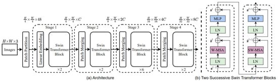 (a) The architecture of a Swin transformer; (b) two successive Swin transformer blocks. SW-MSA and W-MSA are multi-head self-attention modules with shifted windowing and regular settings, respectively [69].
