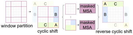 Swin transformer blocks are computed consecutively using the shifting window partitioning method as (see Equations (7)–(10)):