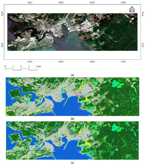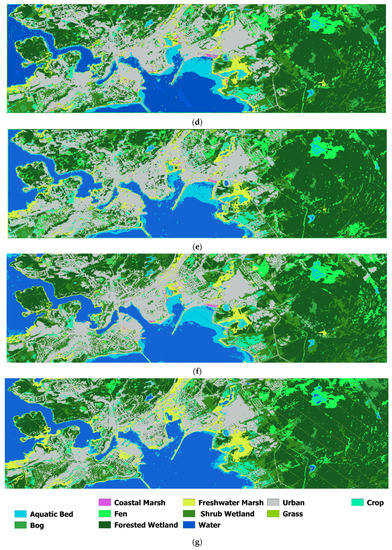 (a) The Sentinel-2 true color of the pilot site of Saint John city, (b) coastal wetland classification maps using the proposed multi-model deep learning algorithm, (c) Swin Transformer, (d) 3D CNN, (e) VGG-16, (f) random forest, and (g) support vector machine.