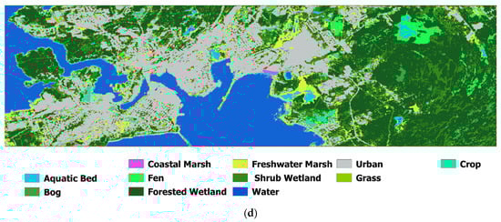 Coastal wetland classification using: (a) Sentinel-2 true color of the study area, (b) the VGG-16 network (Sentinel-2 features), (c) VGG-16 and second 3D CNN networks (Sentinel-1 and Sentinel-2 features, respectively), and (d) the multi-model network.