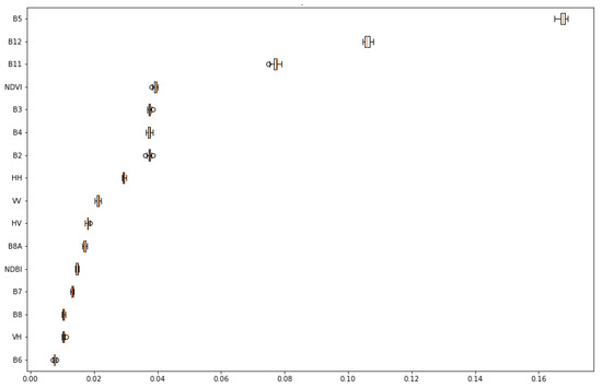 Moreover, the variable importance was measured to better understand the significance and contribution of different extracted Sentinel-1 and Sentinel-2 features. We ran the RF classifier [52] 30 times for the spectral analysis, as shown in Figure 8. As expected, Sentinel-2 bands and indices were more effective for classifying coastal wetlands than the Sentinel-1 backscattering features. Based on the Gini index for the prediction of the test data, the most influential variable for coastal wetland classification was the first vegetation red edge band (i.e., B5). In the RF classifier for attribute selection measure, typically, the Gini index [85] is used. In contrast, the least effective variable was the second vegetation red edge band (i.e., B6). Moreover, the most effective feature of Sentinel-1 was the band. The reason is that is sensitive to double bounce scattering for flooded vegetation, a suitable Sentinel-1 feature for recognizing coastal wetlands. In addition, compared with , the is less affected by the water roughness that is useful for the identification of non-water bodies from water regions.
