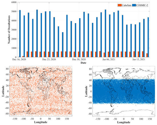 - Schreiner, W.S.; Weiss, J.P.; Anthes, R.A.; Braun, J.; Chu, V.; Fong, J.; Hunt, D.; Kuo, Y.H.; Meehan, T.; Serafino, W.; et al. COSMIC-2 Radio Occultation Constellation: First Results. Geophys. Res. Lett. 2020, 47, e2019GL086841. [Google Scholar] [CrossRef]