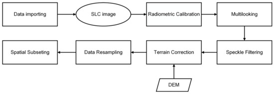 The PALSAR-2 data in the CEOS mode at the level of 1.1 in the study area were preprocessed by SNAP 7.0 software. The SAR data processing steps included: (1) generating a single look complex (SLC) image; (2) radiometric calibration; (3) multi looking (the oblique range directional vision was four, and the azimuthal vision was one) average the power of neighboring pixels [31]; (4) speckle filtering, using the refined Lee filter with the window size of 7 × 7, and removal of coherent noise; (5) terrain correction, correction of SAR geometric distortion using digital elevation model (DEM). The projection was based on the World Geodetic System Datum 1984 (WGS84) regarding the Universal Transverse Mercator (UTM) coordinate system at 44 degrees north latitude; (6) data resampling, image resizing to achieve an optimal resolution of 20 m × 20 m; (7) spatial subset, subset out the study area and typical land type in the experimental area. The preprocessing process of the PALSAR-2 data is shown in Figure 2.
