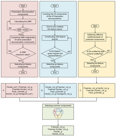 The selection of polarization feature components in this study was mainly considered from three aspects, as follows. (1) SAR images are easily geometrically distorted and cannot be easily interpreted visually. Optical images are more reliable and easier to be interpreted than SAR images; additionally, more previous studies using optical images of the Keriya Oasis are available as references, and OvitalMap could provide a high-resolution interactive platform capable of providing images with maximum resolution of 1 × 1 m. Therefore, Landsat 8 OLI (30 × 30 m) (Figure 1e) and OvitalMap (https://www.ovital.com/, accessed on 28 September 2021) were used as reference images, and polarization feature components’ Signal-to-Noise Ratio (SNR) was calculated. The higher the SNR was, the clearer the image and the better the image quality and denoising effect were [75]. First, components with an SNR of less than 60 dB were eliminated; then, the polarization component with the largest SNR and smallest speckle noise among the three feature components of the same polarization decomposition was selected to reflect the target feature information better. The SNR values of the feature components are given in Table 4. (2) Meanwhile, 25 components were extracted from eight polarization decomposition methods; 300 groups of two-dimensional feature spaces were established, and three groups of them, consisting of six feature components with typical representation and regularity that could distinguish different degrees of salinized soils, were selected. (3) The energy information received by the SAR system reflected the scattering characteristics of the ground feature [45]. The Freeman, Pauli, Freeman Durden, Yamaguchi, VanZyl, Sinclair, and H/A/Alpha methods were used to calculate surface, volume, and double scattering values [17]. The polarization characteristic component was dominated by double scattering even in urban areas [31]. The surface scattering was mainly municipal surface backscattering information, which excluded the influence of vegetation [46]; the vegetation area was dominated by volume scattering [31]. Since information on the change in the land surface vegetation in the arid zone can better reflect the regional salinization status [76], the scattering-type characteristic component was broken down by gathering polarization, and the scattering type was selected as a component of volume scattering. The overall workflow of the feature selection process is presented in Figure 5.