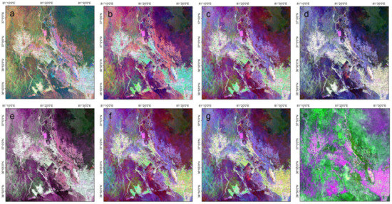 The polarization decomposition results of the RGB standard composite image obtained by: (a) Cloude; (b) Freeman; (c) Freeman Durden; (d) Pauli; (e) Sinclair; (f) VanZyl; (g) Yamaguchi; (h) H/A/Alpha decomposition methods.