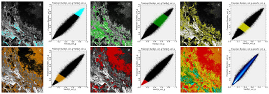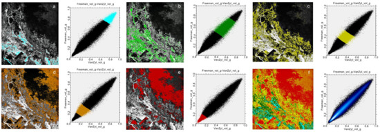 As shown in Figure 7, Figure 8 and Figure 9, the SF, VFD, and VF feature spaces had the same characteristics, i.e., there were obvious differences in the spatial distribution of different degrees of salinized soils in them. The blue areas of the scatter plot denote water bodies, and they are positioned mainly in the upper right part of the scatter plot, the green areas denote vegetation, the yellow areas represent slightly saline soils, the brown areas indicate moderately saline soils, and the red areas are heavily saline soils, and they are positioned mainly in the lower left part of the scatter plot. Figure 10 illustrates a simplified diagram of the three feature spaces.