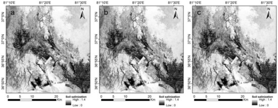 Using Equations (14)–(16), soil salinization inversions were conducted on the whole research area, as shown in Figure 11. In Figure 11, the darker the area is, the lower the degree of soil salinity is, and the brighter the area is, the higher the degree of soil salinity is. The darker areas were mainly in and around the oasis, while the brighter areas were in the lower terrain areas on the oasis periphery.