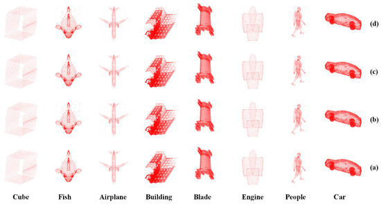 In order to test the performance of the algorithm proposed in the paper, six point cloud models from public datasets were selected as the research data, as shown in Figure 2. The number of points for the Engine model was 3028, the number of points for the Blade model was 50,653, the number of points for the Building model was 93,039, the number of points for the Airplane model was 8176, the number of points for the Fish model was 3164, the number of points for the Cube model was 3177, the number of points for the People model was 5573, and the number of points for the Car model was 29,452. Large-scale noise, with a ratio of 0.02, and small-scale noise, of 20 dB, were added to the point cloud, where the small-scale noise represents Gaussian white noise. Figure 2a shows the original point cloud, Figure 2b shows the point cloud after adding large-scale noise, Figure 2c shows the point cloud after adding small-scale noise, and Figure 2d shows the point cloud after adding multi-scale noise. The experiments verifying the proposed algorithm were carried out based on these point cloud models.