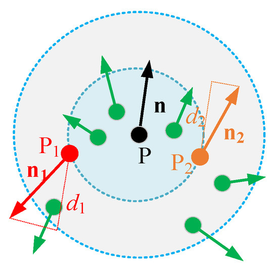 where is the normal vector of points in the k-neighborhood, represents the Euclidean distance between points and , and represents the influence factor of the Euclidean distance to in the k-neighbourhood on . The radius of the k-neighbourhood is taken in this paper.