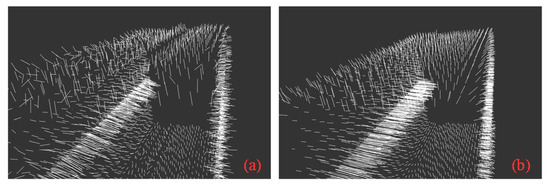 To verify the effectiveness of the normal vector filtering algorithm proposed in this paper, the point cloud normal vector was extracted from the Cube point cloud. The effect of the normal vector extraction is presented in Figure 5, where Figure 5a shows the point cloud normal vector obtained by the moving least square (MLS) method, and Figure 5b shows the normal vector obtained by the normal vector filtering algorithm, proposed in this work.
