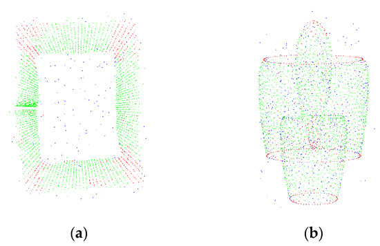To verify the effectiveness of the adaptive point cloud region segmentation algorithm, experiments were performed using the Cube point cloud and the Engine point cloud, and the region segmentation is presented in Figure 6, where the green points represent flat regions, the red points indicate feature-rich regions, and the blue points denote large-scale noise. It is clear from these figures that the segmented, feature-rich regions are mainly concentrated at the edges or corners of the point cloud, which is consistent with the actual situation and verifies the effectiveness of the proposed adaptive point cloud region segmentation algorithm.
