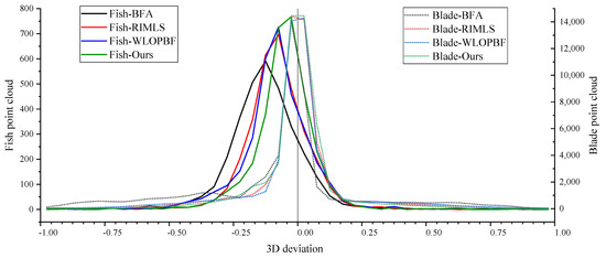 To objectively describe the effect of various methods, when dealing with small-scale noise, the average deviation (AD), point number beyond the critical deviation value (PBCV, when the deviation range is [−1, 1]), and AGE of various methods were determined, when dealing with Fish and Blade point clouds (Figure 11). The AGE of the algorithm proposed in this paper is the smallest, which indicates that the high frequency information features are better maintained. Additionally, the AD and PBCV of the proposed algorithm are the smallest, which further verifies the effectiveness of the small-scale filtering of the algorithm developed in this work.
