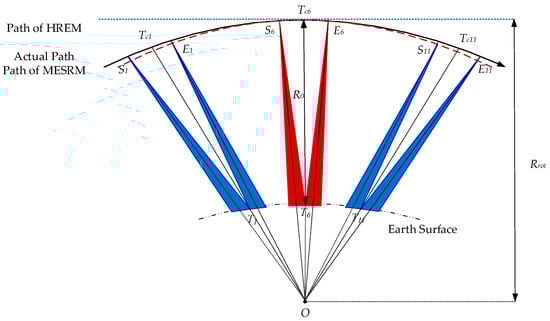 Due to different principles of antenna beam control, the SAR radar system has a variety of working modes. The geometry of the space-borne SAR is shown in Figure 1, and it works in the sliding spotlight mode, which means the azimuth antenna beam points to a fixed position below the scene center. The actual path of the satellite is represented by the black solid line, and the MESRM and HREM paths are denoted by the red dashed line and blue dotted line, respectively. and are the marginal targets in the azimuth direction, and is the central target. Point O represents the beam rotation center. where represent the time when the beam center traverses target , which is named the beam-center-time in this paper. and where are the start and end positions of the illumination for the corresponding target . presents the distance between sensor and central target .