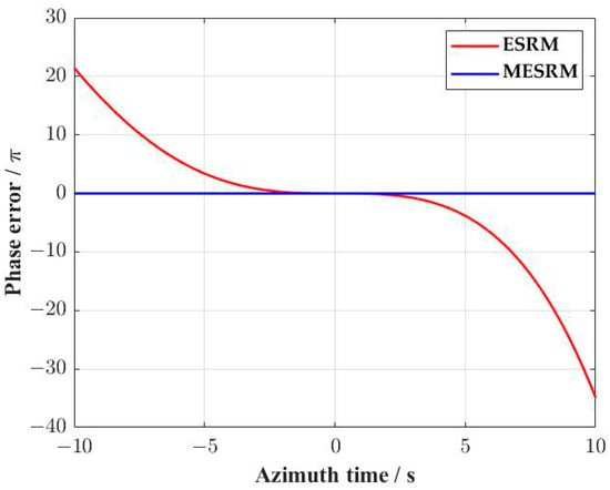 Figure 2 shows the phase errors for the ESRM and MESRM as a function of integration time, which indicates the accuracy of these range models. As can be seen, the phase error cause by ESRM increases significantly as the integration time becomes longer. This phenomenon can be explained by Equations (1) and (2), which describe the range history only by the Doppler centroid frequency and the DFMR. As can be seen from (3) and (4), the MESRM not only perfectly describes the actual range history from the first-order to the fourth-order terms but also partially compensates the higher-order terms, leading to a much smaller slant range error. Therefore, the MESRM is more suitable for extremely high azimuth resolution cases, and the accuracy of the MESRM is sufficient for the target at the scene center.