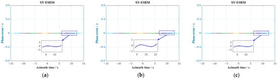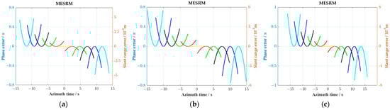 The phase error as a function of azimuth time caused by MESRM. (a–c) represent the errors along azimuth direction in the near, central, and far range cells, respectively. Lines with different colors represent the errors of different targets with a constant interval of 2 km along azimuth direction.