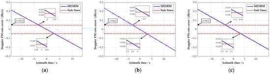 The DFMR error as a function of azimuth time caused by MESRM. (a–c) represent the DFMR errors at near, central, and far range cells, respectively.