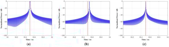 These side effects are compensated by the following processing, which can be incorporated into the residual RCM correction and Doppler phase compensation. The compensation result is revealed in Figure 7c. The red solid line represents the reference position of range compression. Figure 7b,c demonstrates the effectiveness of the range phase perturbation compensation.