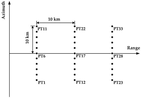 Stimulation results for the point targets are conducted to demonstrate the performance of the MHCA based on the SV-ESRM for HRWS space-borne SAR imaging. The raw SAR data are generated for the point targets using the parameters listed in Table 3, which are laid out on a square area of 20 km 20 km as shown in Figure 8. The distances of different targets along the range and azimuth directions are 10 km and 2.0 km, respectively. The rectangular antenna pattern is assumed in both the range and azimuth directions.