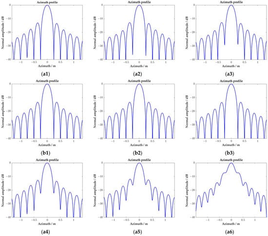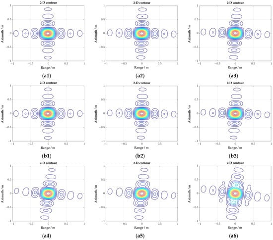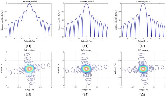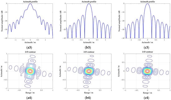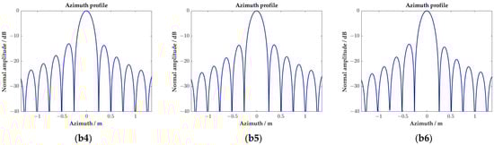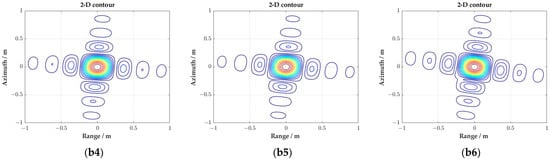 As shown in Figure 11, an azimuth variant rotation in the range side lobe can be observed in the two-dimensional contour of the targets’ imaging results, which is caused by the variation of the Doppler frequency from the near to far range and the spatial variation of the equivalent squint angle. The range side lobes are distributed along the iso-Doppler line, and the azimuth variant rotation is determined by the Doppler centroid frequency when the target is illuminated by the center of the radar beam.