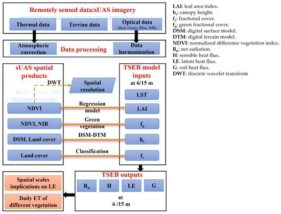 Simple and complex land surface and hydrological models [] have been applied to estimate ET in heterogeneous environments []. Currently, remote-sensing-based energy balance models are widely and routinely applied to produce spatial ET information on an operational basis for use in water resources management []. These models use thermal infrared (TIR) data as a boundary condition and solve LE as a residual component of the surface energy balance (SEB) []. Generally, two types of SEB models are applied, both of which use optical and TIR remote sensing information to calculate ET through the radiation and energy balance equations. The first is the One-Source Energy Balance (OSEB) model, which treats the canopy-substrate surface as a single layer []. The second is the dual source, such as the Two-Source Energy Balance (TSEB) model [], which partitions the energy fluxes between canopy and soil/substrate []. The TSEB model was originally developed for homogenous partial vegetation cover, and then the framework was upgraded to accommodate the effects of heterogeneous partial vegetation, as opposed to the OSEB models [,]. However, both model types tend to show greater uncertainty in cases of heterogeneous landscapes and/or natural environments [,]. From an operational perspective, identifying individual fields and other small hydrological features in a heterogeneous environment requires a more advanced technology that can provide high-resolution data in a timely manner. Satellite remote sensing can provide radiometric surface temperature and optical observations at a spatial scale of 10 to 103 m2; however, satellite measurements are affected by various landscape features and require semi-empirical algorithms to convert radiances to physical quantities for SEB modeling []. Although satellite data fusion has improved the information, the presence of clouds during satellite overpass can limit its operational application []. The development of small unmanned aerial systems (sUAS) with novel instrumentations and lightweight sensors has made high multispectral resolution possible without the previously mentioned limitations. Additionally, these systems are “flexible in timing” [].