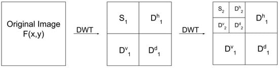 The wavelet energy is calculated as the sum of squares of the coefficients at a level of decomposition, , divided by the sum of squares all of the coefficients in . The formula that describes the wavelet energy is shown in Equation (3).