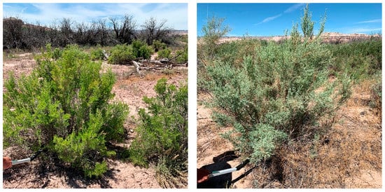 In natural environments that are characterized by a heterogeneous natural ecosystem and low precipitation, such as the San Rafael River corridor in Utah, the major component of the water balance is vegetation transpiration (T) and soil evaporation (E) or the combined evapotranspiration (ET). This location also exhibits significant high spatial variability in ET information due to several factors that include soil moisture availability, groundwater depth, leaf area, topography, land surface temperature and vegetation species []. Moreover, the San Rafael River corridor is dominated by treated tamarisk, which increases the complexity of the ecosystem’s water use and poses additional difficulties beyond the previously mentioned challenges due to the high variability of this vegetation in space and time.