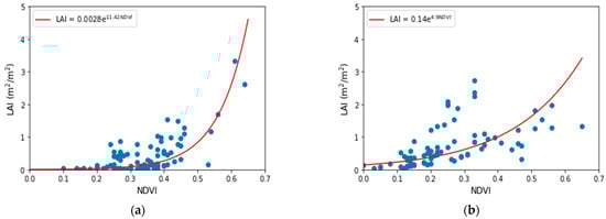 LAI-NDVI relationship for the flights on (a) 19 June 2019 and (b) 22 July 2019.