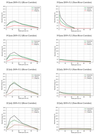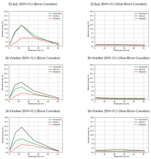 Figure 8 shows the wavelet energy of NDVI for two different features, the river corridor and the remaining area surrounding the river corridor (non-river corridor). Each plot describes the change in the wavelet energy (%) in the various directions (horizontal, vertical, diagonal) corresponding to multiple spatial resolutions/model grid sizes. The comparison of the wavelet energy curves for the two features shows that they have completely different shapes for all flights (June, July, and October). For the area adjacent to the river (river corridor), wavelet energy resembles a concave down shape with highest values of energy appearing in the vertical (north-south) direction, medium in the horizontal (east-west) direction, and lowest in the diagonal (northeast-southwest and northwest-southeast) direction. Based on Figure 8, the vertical and horizontal curves show the presence of two dominant scales of spatial heterogeneity depicted by two wavelet energy maxima ranging between 6.4 and 12.8 m for all sUAS flights. The wavelet energy values at 6.4 m and 12.8 m spatial resolutions are relatively close, with a slight increase at 12.8 m. However, in the diagonal orientation, the wavelet energy values are very low, with the wavelet-based dominant scale peaking at 12.8 m. In the non-river corridor area, the wavelet energy curves in the various directions (vertical, horizonal, and diagonal) flatten out without the presence of a dominant spatial resolution/scale, with one exception. FL1 on 19 June 2019, shows a high wavelet energy value present at very low spatial resolution, which may occur as a result of different vegetation patterns and types existing in that area.