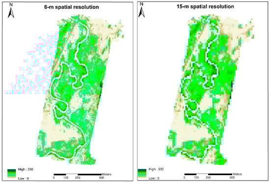 Figure 11 shows an example of modeled instantaneous LE (W/m2) at 6 m and 15 m resolutions for FL1 on 22 July 2019. The maps show high spatial variability in LE values, varying between 0 W/m2 and 330 W/m2. A similar trend in spatial variances has been observed for other LE maps at different dates and times. Many factors related to soil moisture and differences in vegetation species and vegetation cover could potentially cause these variations in LE. High LE values correspond to the vegetation along the river corridor due to the presence of dense patches that reach full green ground cover. This is true for all of the vegetation along the riverbank.