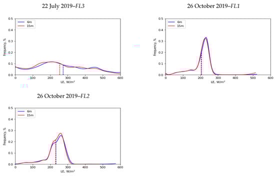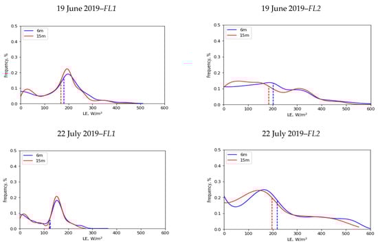 Frequency curves of instantaneous LE (W/m2) for all sUAS flights at 6 m and 15 m. Note: blue dashed line represents the spatial mean of LE at 6 m resolution, red represents the 15 m resolution.