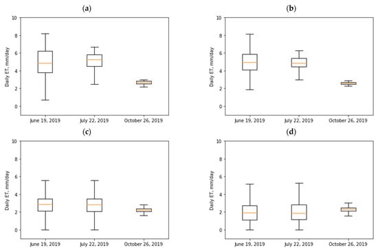 Daily ET estimation for each vegetation type on different sUAS flight dates in the study area. (a) Cottonwood. (b) Willow. (c) Grass/shrubs. (d) Treated tamarisk.