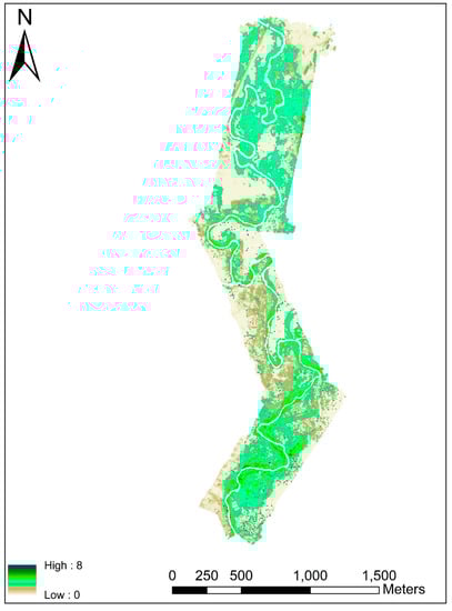 Coarse resolution imagery, such as Landsat at 30 m or SPOT at 20 m, may not be enough to capture the spatial heterogeneity in a natural environment []. However, the recent development of sUAS remote sensing technology with spatial resolutions of 10 cm or less allows for the capture of spatial variability in the riparian vegetation in locations such as the San Rafael River corridor. In this study, multispectral images from several flight campaigns acquired by AggieAir sUAS were classified to identify and map the features/classes of interest in riparian scenes using supervised classification, in which the spectral signatures/training samples from the image are extracted by specifying the known or visibly distinct features. Training samples were extracted from the images using ArcGIS 10.7 and then used to classify the entire map into several features, including willow, water, treated tamarisk, bare ground, developed/road, grass/shrubs, and cottonwood. Flight images show distinct spectral variations between different vegetation types, mostly willow (dense with green tones), treated tamarisk (represented by a dark brown color), and cottonwood (large green leaves and thick foliage).