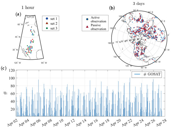 Spatial and temporal distribution of GOSAT methane observations used in cross-validation. (a) 1-h GOSAT observations separated in three sets after thinning; (b) active observations (blue circles) versus passive observation (red triangles) over 3 days in the cross-validation framework to estimate the covariance parameters; (c) frequency of GOSAT observation per hour used in cross-validation.