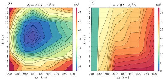 Estimation of the horizontal length scale (, x-axis) and the vertical length scale (, y-axis) together through (a) a cross-validation cost function of passive observations and with (b) a cross-validation cost function of active observations .