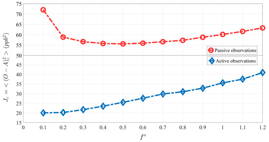 Figure 2a and Figure 3 (red curve) illustrate the estimation of , , and , after the first iteration that corresponds to the minimum value with the specified optimization resolution in the cross-validation (i.e., passive observation) space. A cost function based on the active observations, , is constructed to compare with the cross-validation results. Figure 2b and Figure 3 (blue curve) represent the similar parameter estimation procedure described above, but over the active observations (i.e., training set). In Figure 3, the evaluation against active observations (blue curve) always shows smaller variances than the evaluation against passive observations (red curve). It implies that the use of active observations overestimates the performance (a well-known property of cross-validation optimization [31]) of the analysis. In addition, the use of passive observations in cross-validation results in the existence of a minimum variance cost-function, consistent with the finding of Ménard and Deshaies-Jacques (2018) [31].